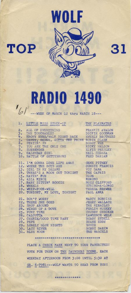 It wasn’t long before I was blowing off my afternoon naps and, instead, spent those two hours listening intently as that little clock radio next to my crib played one 45 after another. In time, I apparently taught myself to lean over the railing and with my right thumb move the tuner dial on that old brown GE clock radio of mine back and forth between one of two Top 40 stations, WNDR, at 1260 on the AM dial, and WOLF, just a half a turn away at 1490.